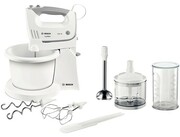 Funkcja Turbo:tak;Funkcje:mieszanie, ubijanie piany, zagniatanie, miksowanie, rozdrabnianie (siekanie);Funkcje dodatkowe:możliwość pracy ze stopą miksującą, praca pulsacyjna, tryb Turbo;Gwarancja:24 miesiące;Informacje dodatkowe:możliwość mycia końcówek w zmywarce, przycisk zwalniający końcówki, uchwyt soft touch;Barwa:biało-szary;Liczba poziomów obrotów:5;Moc silnika:450 W;Pojemność misy roboczej:3 l;Regulowanie obrotów:mechaniczna-skokowa ;Seria:ErgoMixx;Seria:Bosch ErgoMixx;Wariantowanie seria(nie uzupełniać) :Bosch ErgoMixx MFQ364;Wariantowanie:stojak z misą, stopka miksująca, rozdrabniacz;Wykonanie korpusu:tworzywo sztuczne;Wykonanie misy roboczej:tworzywo sztuczne;Mieszadła:haki, mieszadła uniwersalne;Mieszadła:uniwersalne do mieszania, haki;Dodatkowe wyposażenie:misa obrotowa, stopa miksująca, kielich do miksowania, rozdrabniacz;Przystawki:misa obrotowa, rozdrabniacz, stopa miksująca;Pozostałe:instrukcja użytkownika, kielich do miksowania, szpatuła;Zasilanie:sieciowe 230-240 V 50/60 Hz