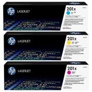 HP CF253XM - Tonery kolorowe 201X do HP Color LaserJet Pro M252, M270, M274, MFP M270, MFP M277 Oryginalny zestaw 3 tonerów kolorowych HP CF253XM o zwiększonej wydajności do drukarek. Tonery HP 201X przeznaczone są do poniższych modeli czarno-białych drukarek laserowych i urządzeń wielofunkcyjnych: HP Color LaserJet Pro M 252 dw HP Color LaserJet Pro M 252 n HP Color LaserJet Pro M 270 Series HP Color LaserJet Pro M 274 dn HP Color LaserJet Pro M 274 n HP Color LaserJet Pro MFP M 270 Series HP Color LaserJet Pro MFP M 277 dw HP Color LaserJet Pro MFP M 277 n Zestaw zawiera tonery: Cyan CF401X, Magenta CF403X, Yellow CF402X. Kod OEM: HP 201X Kod Producenta: CF253XM Kolor: Cyan, Magenta, Yellow Wydajność: 3 x 2.300 stron A4 przy 5% pokrycia strony. Ilość w opakowaniu: 3 szt.