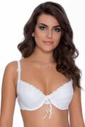 Fason modeluje biust, podkreślając kobiece kształty i sprawiają, że dekolt przyprawi o zawrót głowy. Miseczki jak i boczki pokrywa ażurowa koronka, a przy łączeniu subtelne wiązanie w postaci rozciągliwej tasiemki. Biustonosz posiada regulowane, odpinane, wzorzyste ramiączka oraz wyjmowane wkładki. Skład: 80% poliamid, 15% elastan, 5% bawełna.