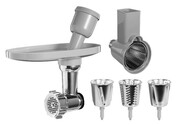 Maszynka do tarcia i krojenia SMEG Uniwersalna przystawka do miksera SMEG uwolni cię od prostych lecz czasochłonnych i męczących czynności jak tarcie lub krojenie sera, warzyw, owoców lub innych składników. Akcesorium składa się z 6 części z czego 4 to wykonane ze stali nierdzewnej cylindryczne tarcze o powierzchni przeznaczonej do różnych zadań - do cienkich plasterków, do grubych plasterków, do grubych wiórków oraz do drobnych wiórków. Przystawka i popychacz zostały wykonane z wytrzymałego tworzywa sztucznego. Zestaw pasuje do wszystkich mikserów planetarnych marki SMEG. Nie jest przystosowany do mycia w zmywarce. Maszynka do mielenia mięsa SMEG Przystawka została zaprojektowana z myślą o bezwysiłkowym mieleniu mięsa za pomocą mocnego silnika znajdującego się w mikserach marki SMEG. Korpus maszynki został wykonany z wytrzymałego stopu aluminium który zapewni stabilność nawet przy najcięższych zadaniach. Misa zsypowa została natomiast wykonana z lekkiego tworzywa sztucznego. W zestawie znajdują się 3 wymienne dyski o różnych średnicach otworów: duże o średnicy 8,0 mm, średnie 4,2 mm oraz małe 3,0 mm. Dodatkowo w komplecie znajdziesz nasadki do libańskich Kebbe oraz do wypełniania kiełbas, silikonowe akcesorium do mycia małego i średniego dysku, popychacz oraz pojemnik z pokrywką.