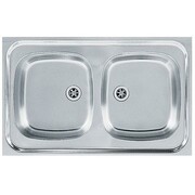 Nakładany zlewozmywak 2-komorowy ze stali szlachetnej. Szerokość 800 mm. Komory o głębokości 150 mm. Wysokość fryzu 30 mm. Wykończenie faktura LEN.